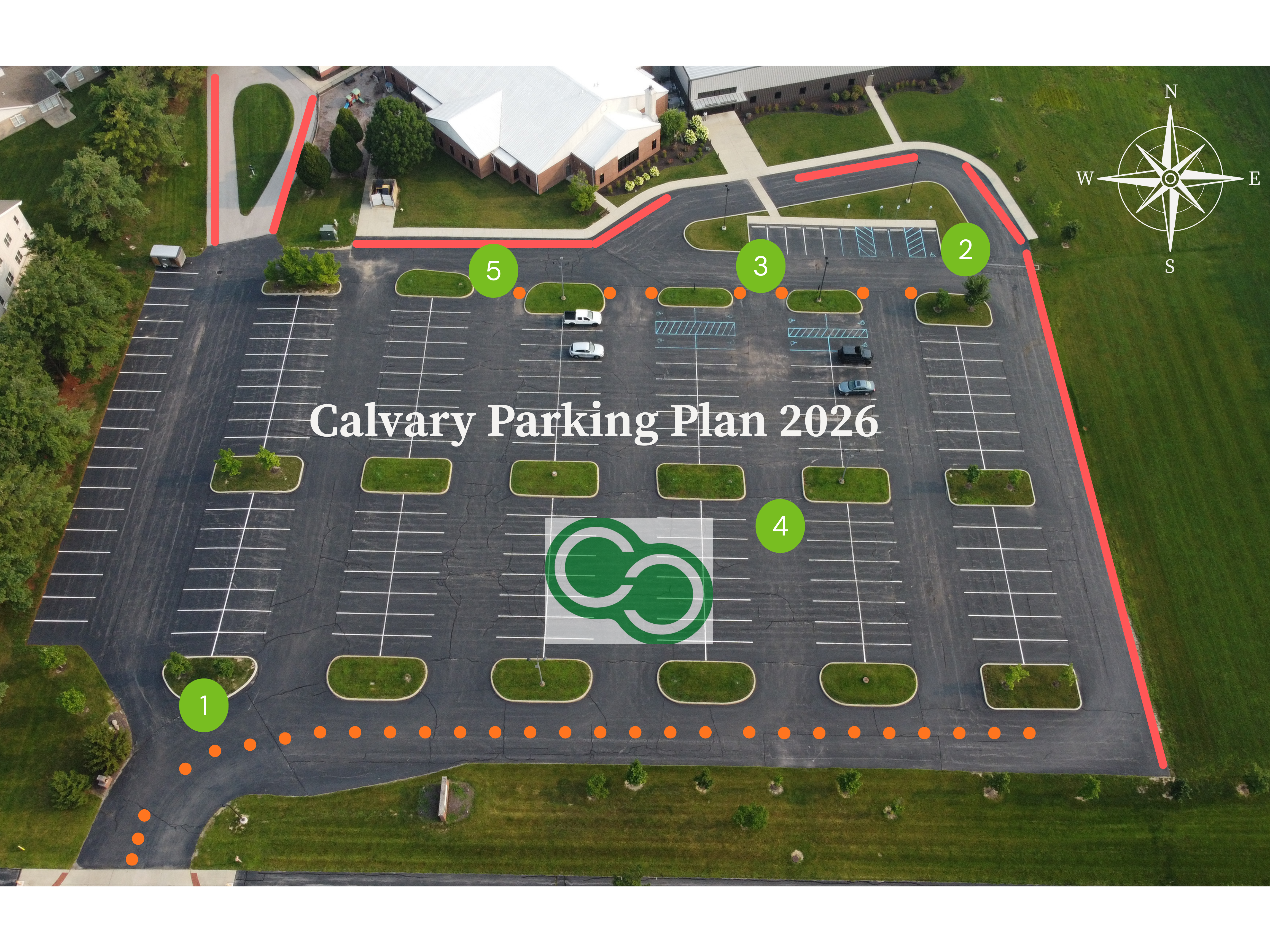 - If we run out of spots, please park along the curbs and islands nearest the dumpster, as marked in Red on the map. We can also park cars along the circle drive. We can park on the pavement along the East side of the lot, but Please do not park people in the grass on the East side of the lot. If necessary, have cars park in the open handicap spots.